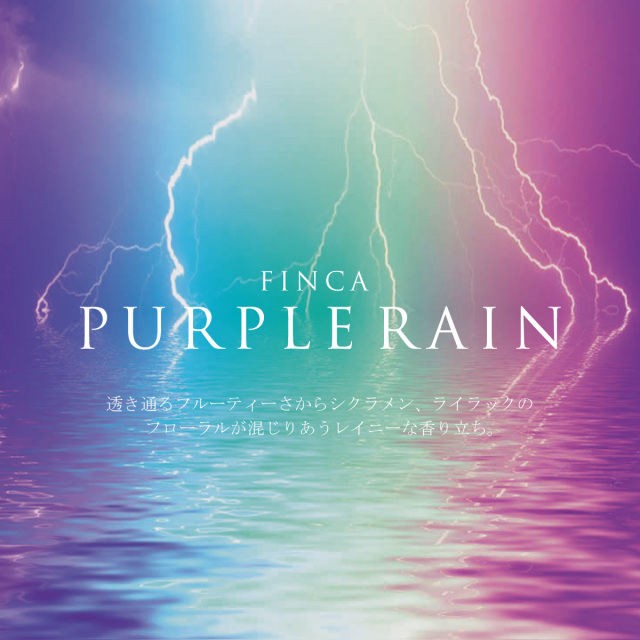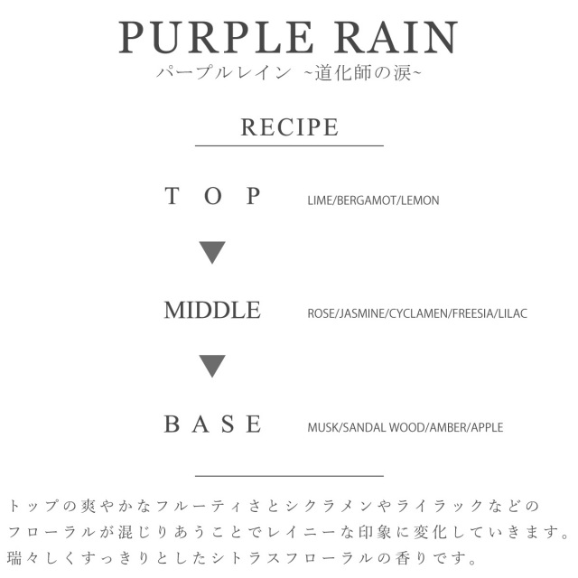紫色の雨、パープルレインをイメージモチーフにした、レイニーでシットリした涼しげな香感。真夏のシャワーをたっぷり浴びた後のようなサッパリ感に満ちています。