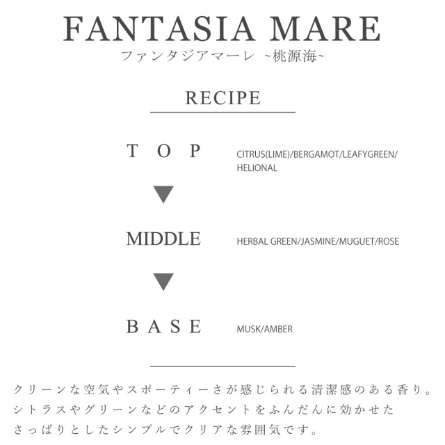 とにかく一度お使いいただくとその効果の程がわかるかも知れません。夢から抜け出てきた「ファンタジア・マーレ」はロマンチスト専用フレグランスです・・。