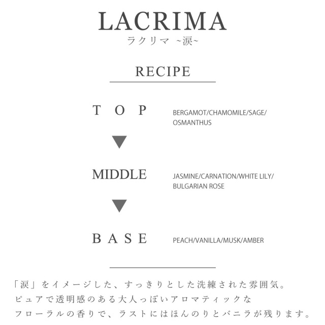 人それぞれの涙にそれぞれの香り…というイマジネーションから生まれた香りはピュアで透明感のある香りに仕上がっています。スッキリとした都会的で洗練されたイメージが広がっていきます。「涙」の味を知るロマンチスト達に絶大な人気があるのも分かるような気がします。