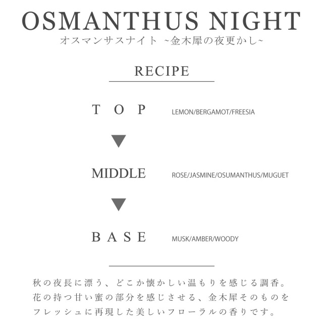 秋の夜長に漂う、どこか懐かしいキンモクセイの温もりを感じる甘い調香・・・でしたが、この「オスマンサスナイト」は一年中あなたを包んでくれます。