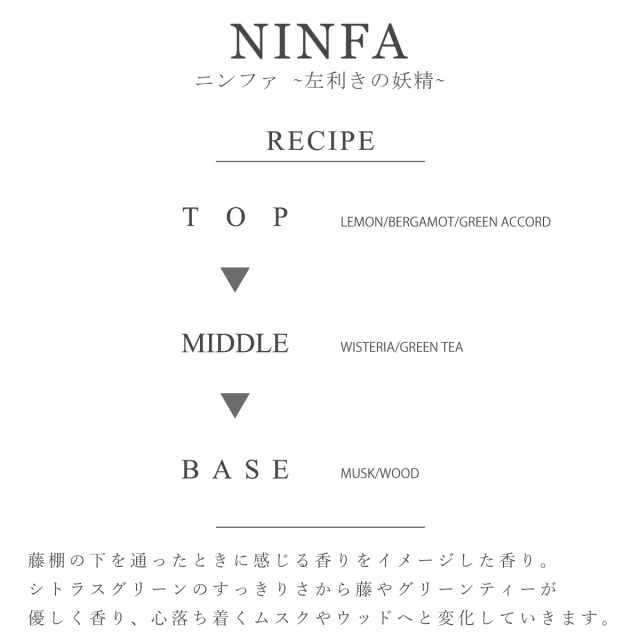 それから藤の香りとグリーンティの香りが優しく香り、ラストに心落ち着くウッディーノートへ変化していきます。)