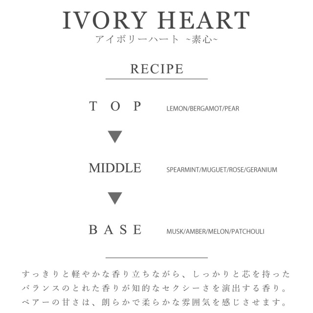 スッキリ、軽やかな香り立ちながら、しっかり芯を持ったバランスのとれた香りが知的なセクシーさを演出します。